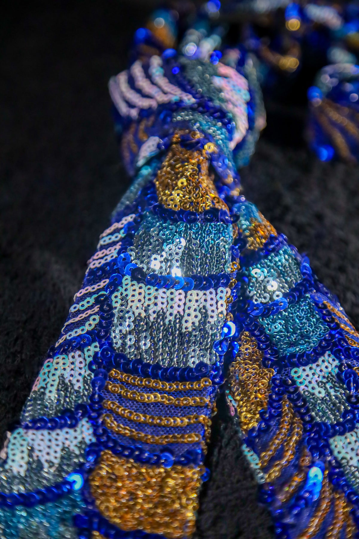 • Multi-tone sequin embroidery (royal blue, gold, silver)